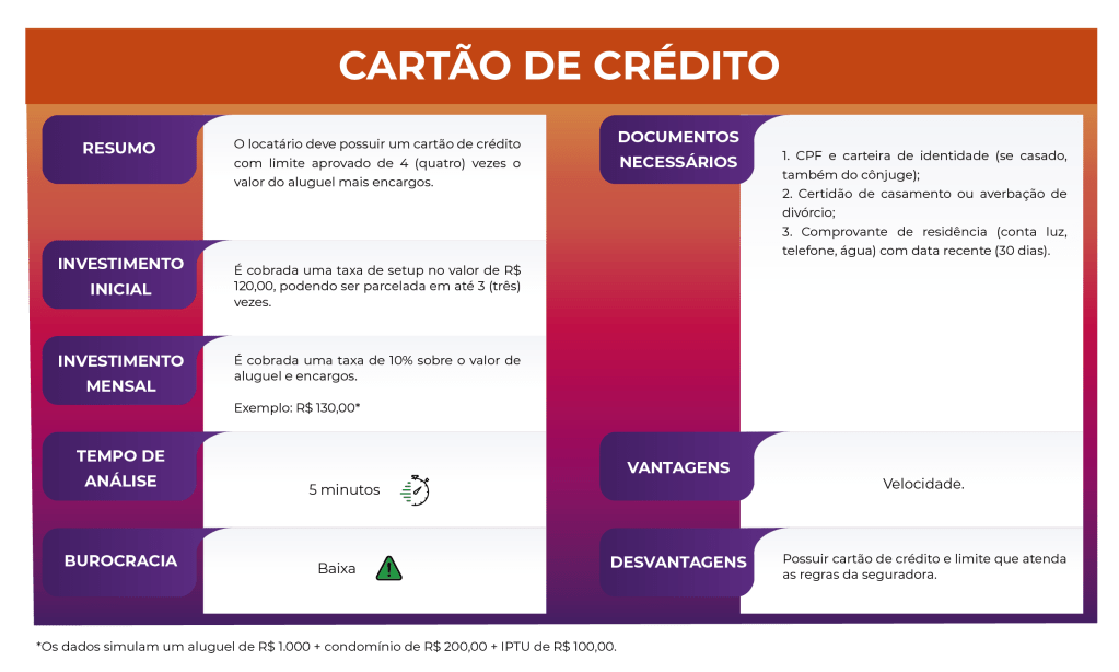 A modalidade do cartão de crédito possui a taxa de serviço de 10% sob o valor do aluguel e encargos. Nesta modalidade a taxa de serviço poderá ser paga pelo inquilino com o cartão de crédito o que permite mais facilidade para negociação.