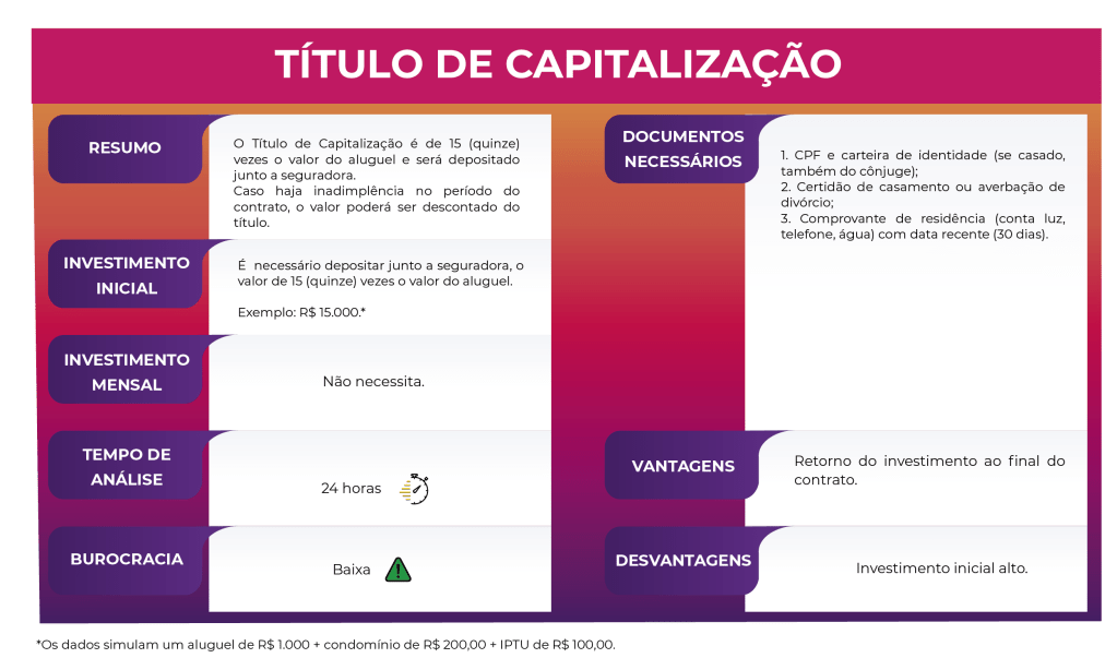 Uma dessas opções de Garantias Locatícias é o TÍTULO DE CAPITALIZAÇÃO: